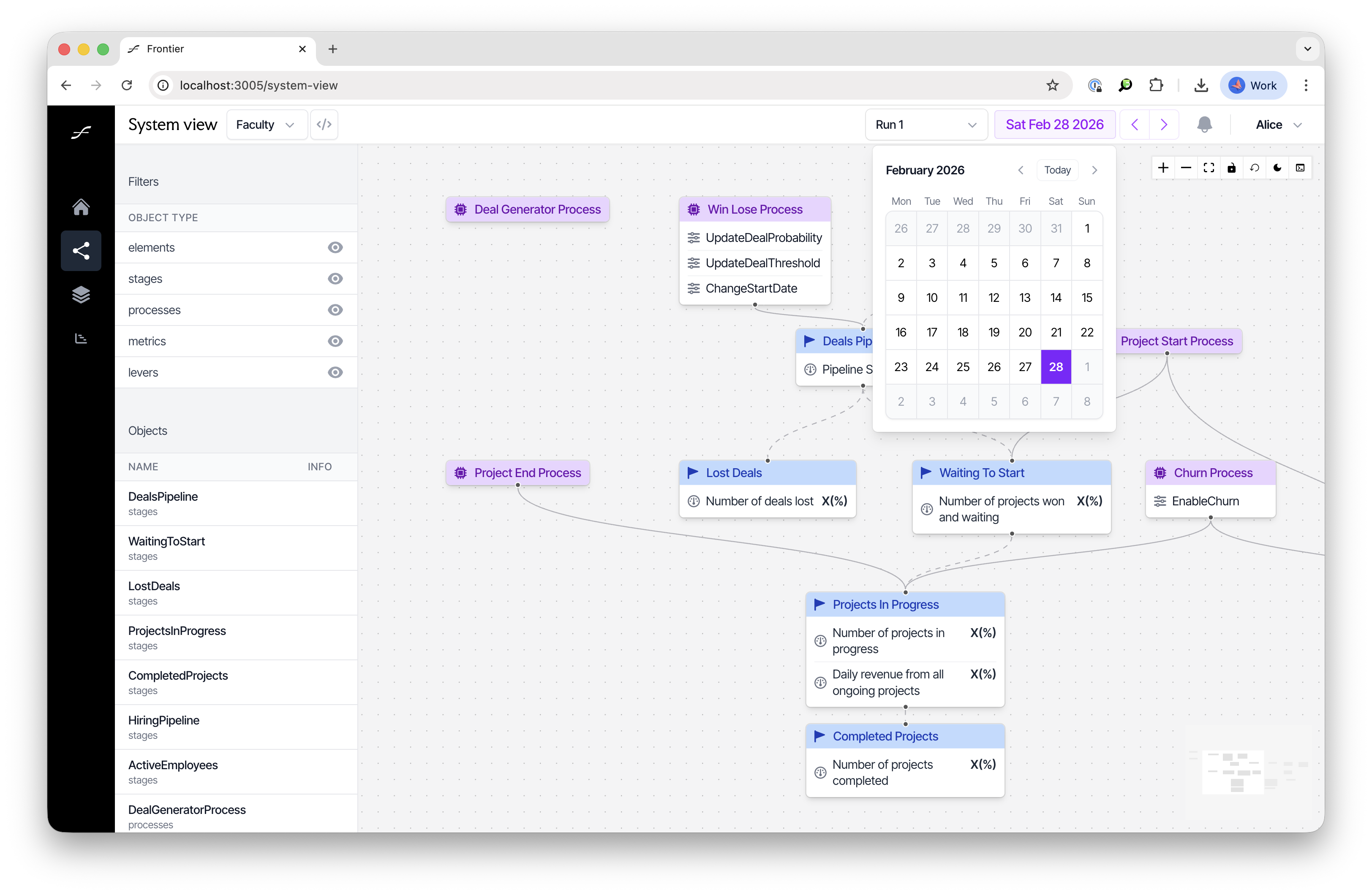 I wanted a way to show the underlying Computational Twin technology that powers Frontier, Faculty’s decision intelligence tool that simulates business event data into the future. I felt strongly about the concept and took it from sketches through to a working demo for sales teams and delivery teams to use to work on Frontier projects.